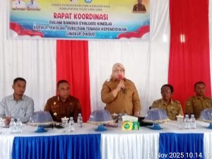 Sulteng-sudutpandangrakyat.com- Bertempat di gedung PGRI Kecamatan Tojo Selasa ( 11/10/2025) Kadis Pendidikan dan Kebudayaan Tojo Una una Aspan P. Taurenta, SH, dan Wakil Bupati Tojo Una una Hj.Surya ‚S.sos,M.Si. di sambut dengan baik dan dengan semangat Tutuwuri Handayani oleh seluruh peserta Rakor ( Rapat Koordinasi) dalam rangka evaluasi kinerja di lingkup Dinas Pendidikan dan Kebudayaan Tojo Una una — Sulawesi Tengah.